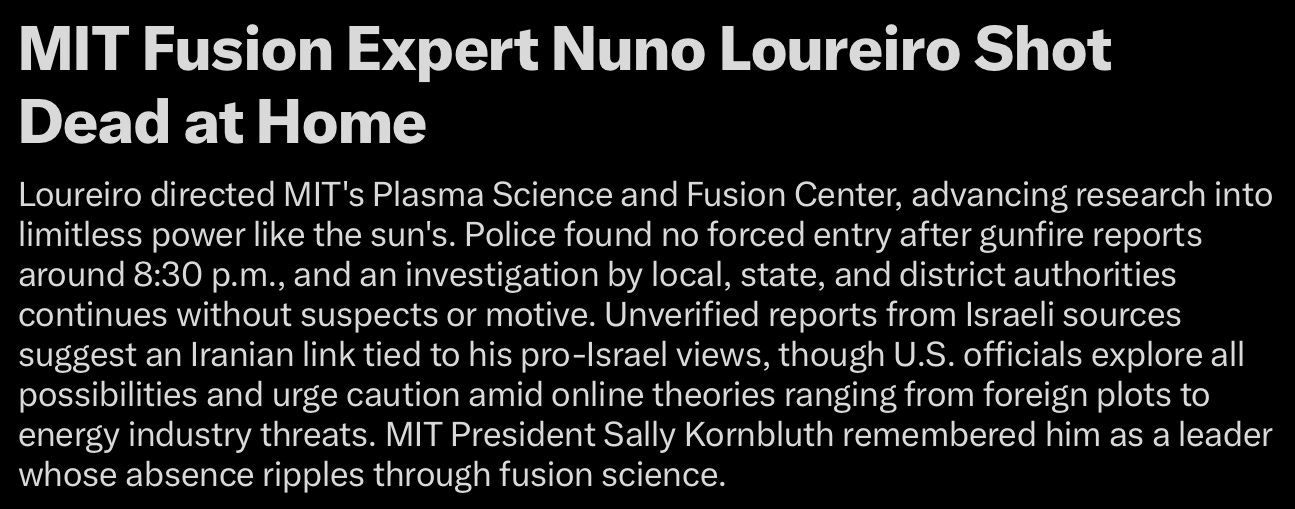 Loureiro was director of the MIT Plasma Science & Fusion Center and Herman Feshbach Professor of Physics working on nuclear fusion to create a virtually unlimited clean energy source. He was shot multiple times at night in his home but…he’s not the first.